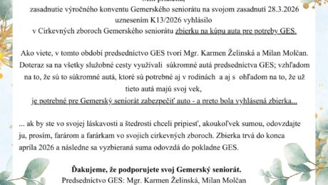 Milé sestry a bratia, vážení priatelia! Do pozornosti vám dávame zbierku, ktorá bola schválená na poslednom výročnom konvente Gemerského seniorátu v Kobeliarove. Jedná sa o kúpu motorového vozidla pre potreby Gemerského seniorátu, ktoré nie je vecou prepychu, ale nevyhnutnou záležitosťou pre optimálne fungovanie, spravovanie, riadenie a reprezentovanie seniorátu. Viac informácií sa dozviete po kliknutí na