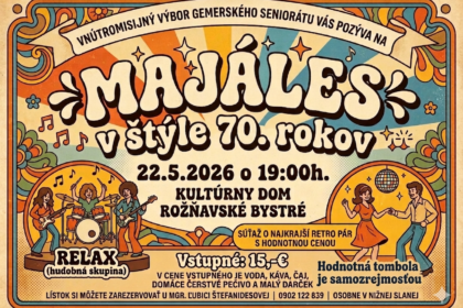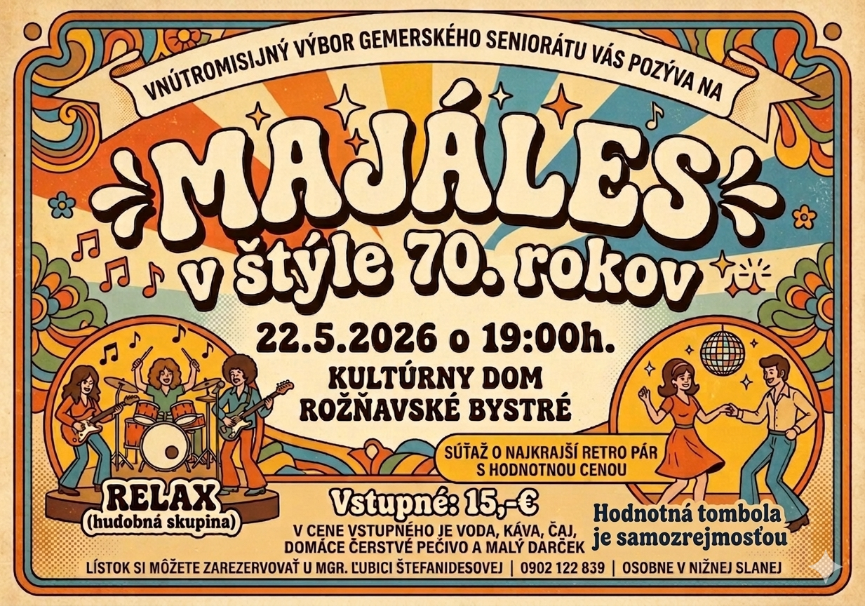 Vnútromisijný výbor Gemerského seniorátu ECAV na Slovensku si vás dovoľuje pozvať na Majáles v štýle 70. rokov, ktorý sa uskutoční 22.5.2026 v KD v Rožňavskom Bystrom so začiatkom o 19.00 hod. Tešíme sa na vás. Všetky ostatné informácie nájdete na plagáte.